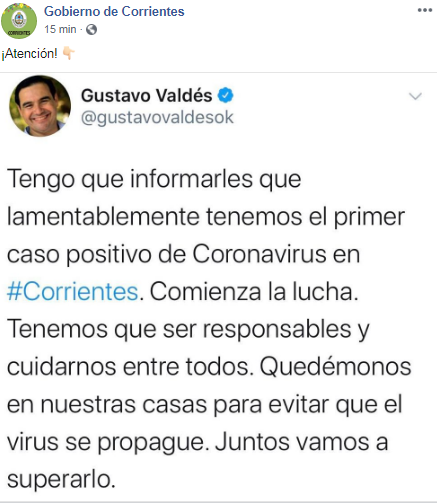«Tenemos el primer infectado», dijo esta tarde el Gobernador de Corrientes, Gustavo Valdés, al comunicar que las autoridades epidemiológicas recibieron información que certifica que un hombre que estuvo en Europa contrajo Coronavirus.