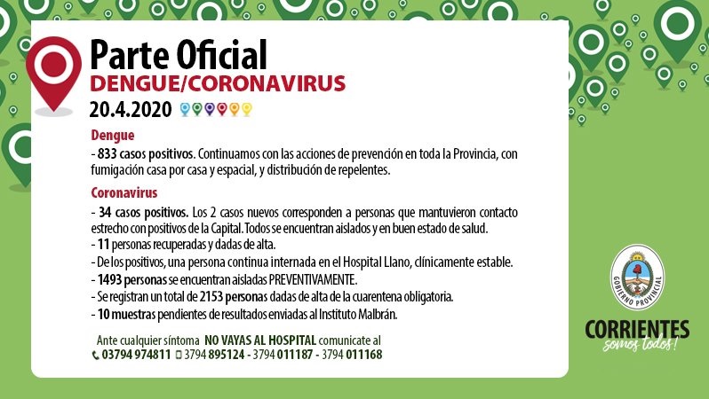 Parte oficial de la situación de Coronavirus y dengue en la provincia de Corrientes. Informe del Gobierno de la Provincia de Corrientes.