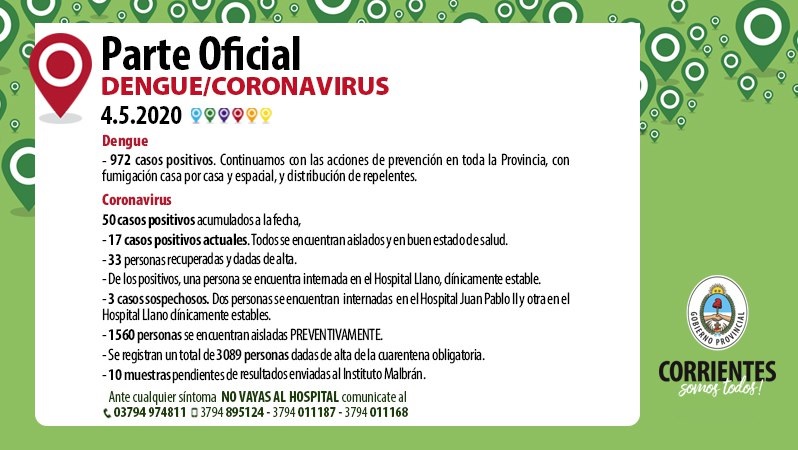 Iniciando la semana, el Gobierno de la Provincia de Corrientes, dio a conocer el estado sanitario en la Provincia de Corrientes, con respecto al Dengue y Coronavirus.