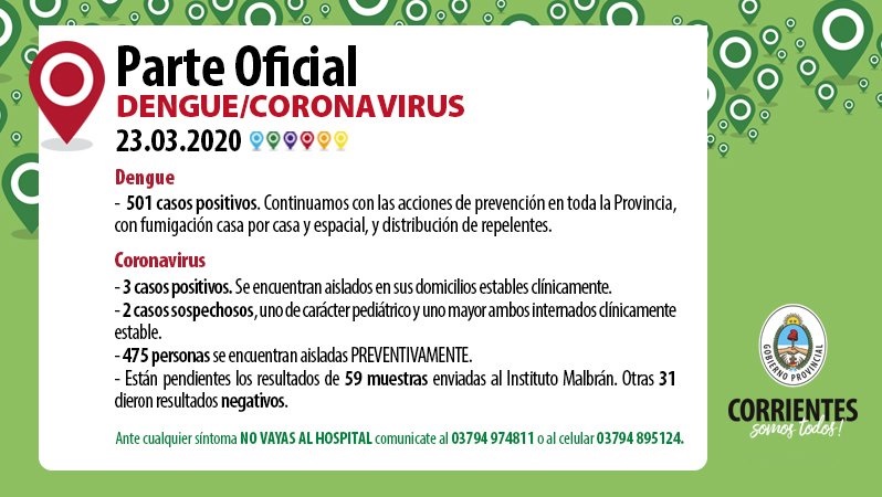 Parte oficial del Gobierno de la Provincia de Corrientes. Navegación de entradas Cómo se actúa en Corrientes ante un caso sospechoso de coronavirus Detienen a joven motociclista que por las redes sociales incitó a romper la cuarentena