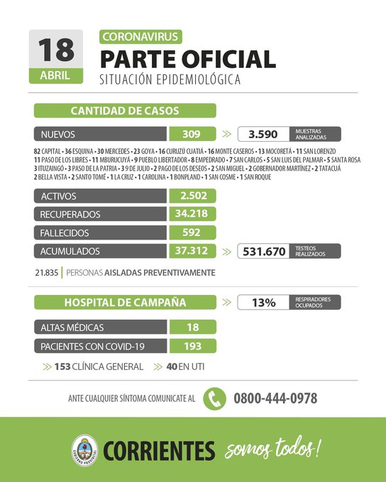 El Gobierno informó este domingo que se produjeron siete nuevos fallecimientos por coronavirus y se registraron 309 contagios en las últimas 24 horas en Corrientes.