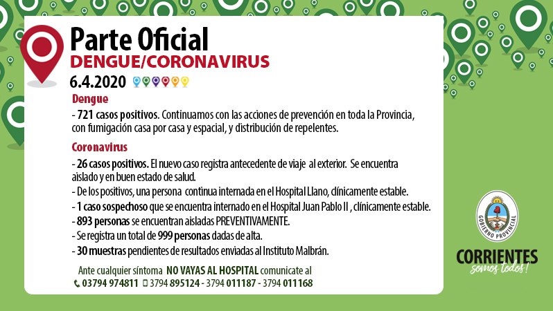 893 personas se encuentran aisladas preventivamente, 999 personas dadas de alta, 30 muestras pendientes en el Instituto Malbrán.
