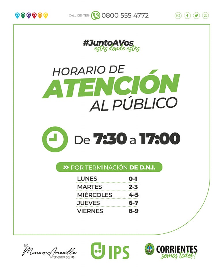 El Instituto de Previsión Social de Corrientes comenzó a atender en horario corrido (7:30 a 17 horas) con el objetivo de brindar una mayor y mejor prestación de todos sus servicios. El Interventor del organismo provincial Marcos Amarilla anunció que desde el mes de febrero y tras un análisis con todo el personal, se estableció modificar nuestro horario.
