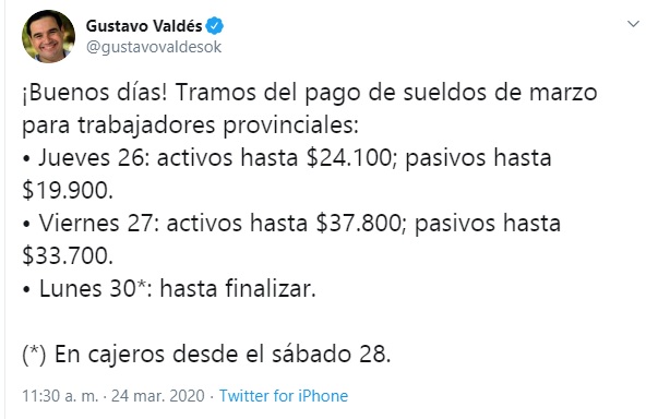 El jueves 26 del corriente arranca el pago a activos y pasivos correspondiente al mes de marzo 2020, según lo anunció el Gobernador de la provincia de Corrientes, Gustavo Valdés, en su cuenta de twitter.