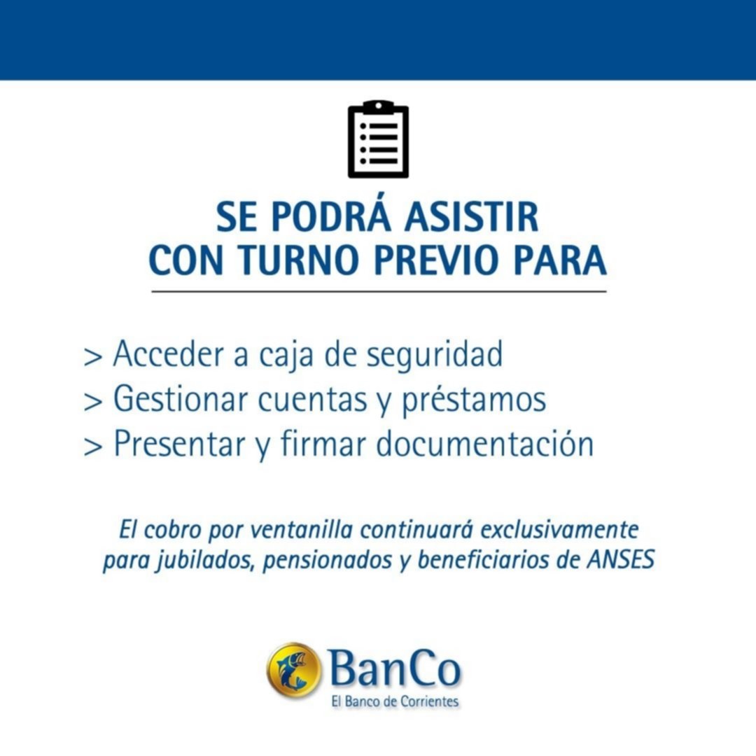 En el caso del Banco de Corrientes, el lunes retomará la actividad de la banca comercial, para lo cual habrá que gestionar turnos a través de la página web de la entidad,tanto para cuentas personales como personas jurídicas.