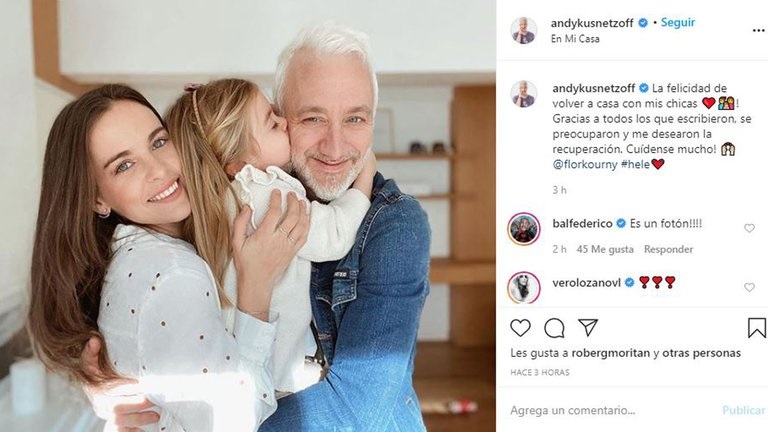 “¡La felicidad de volver a casa con mis chicas! Gracias a todos los que me escribieron, se preocuparon y me desearon la recuperación. ¡Cuídense mucho!”, escribió Andy junto a la foto en la que se lo ve abrazando a su pareja y a su pequeña. Ella, feliz con el regreso de su padre, lo besa en la mejilla.