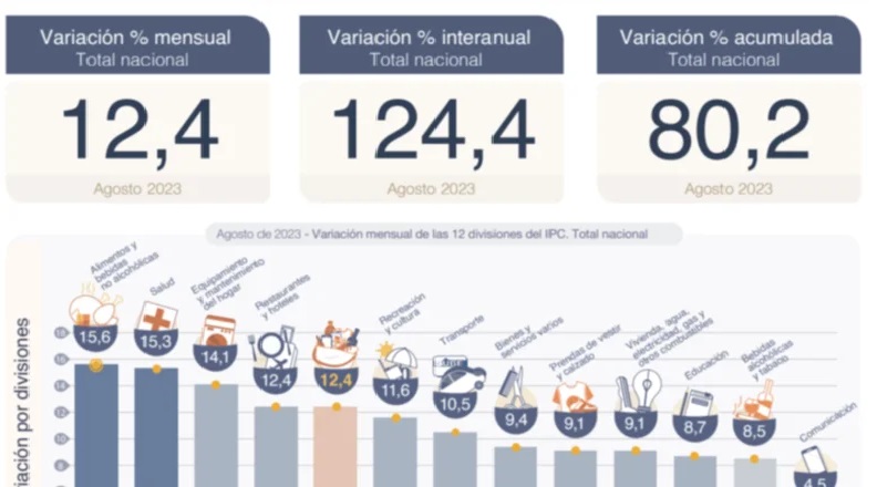 Cabe resaltar que a nivel nacional, la cifra es del 12,4% y eso la convierte en la más alta en 32 años (desde 1991). Asimismo, en los primeros ocho meses del año, la inflación acumuló 80,2% y en la comparación interanual alcanzó 124,4%, de acuerdo con el informe del instituto estadístico.