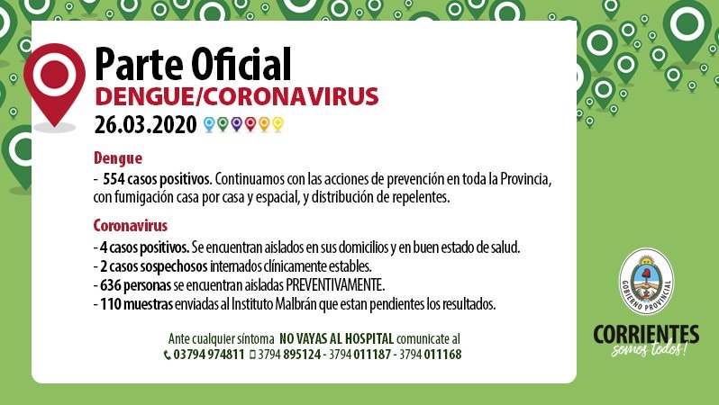 El Gobierno provincial informó que sigue en aumento los infectados por la enfermedad vectorial. Los positivos de coronavirus se mantienen en 4 en la provincia.