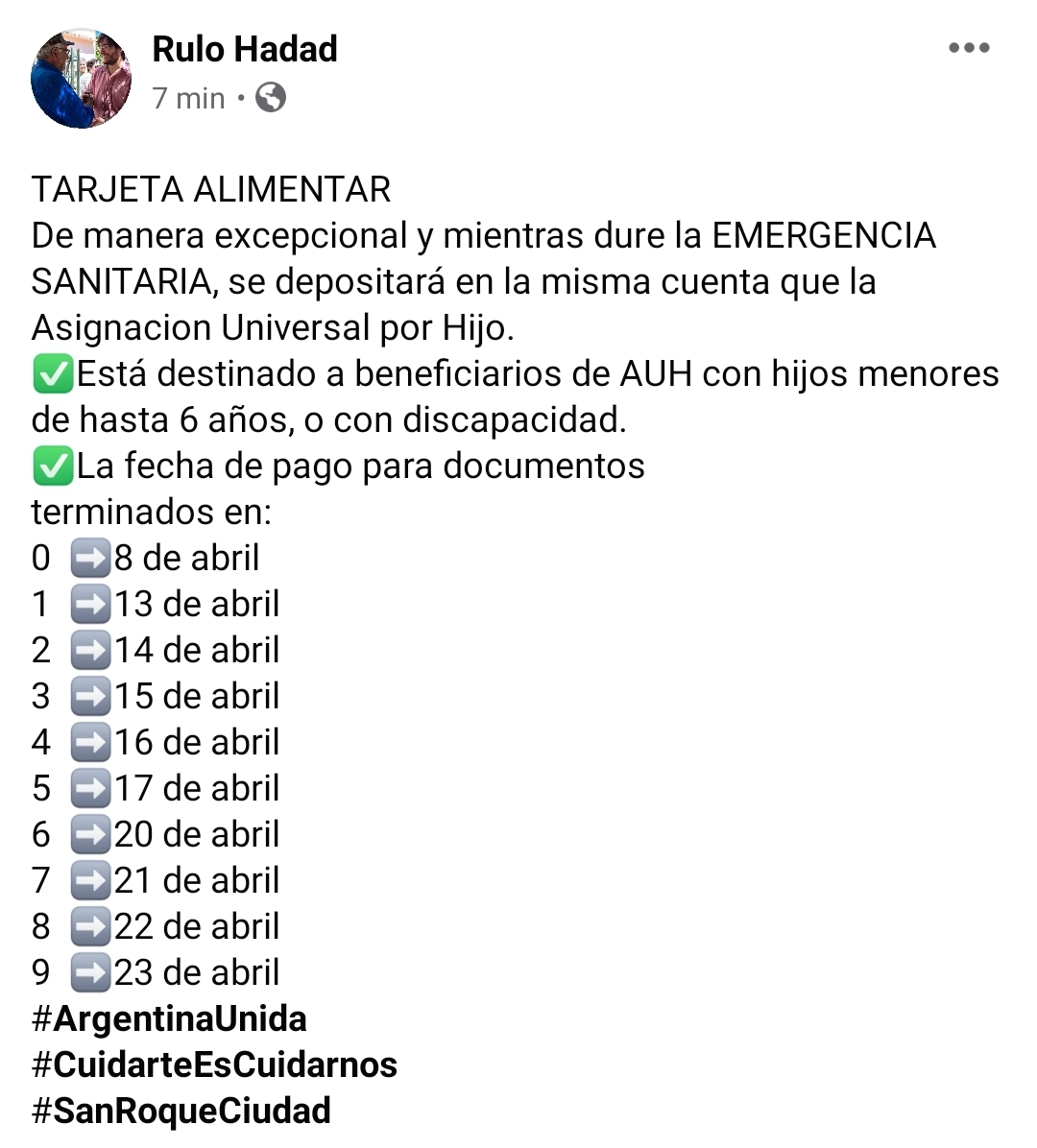 Desde la Municipalidad de San Roque, informan el cronograma de beneficiarios de la Tarjeta Alimentar.
